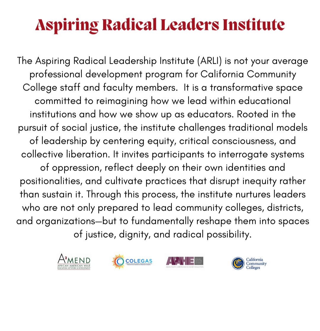 The Aspiring Radical Leaders Institute (ARLI) is a statewide, two year-long professional development opportunity that contributes to the California Community Colleges Chancellor’s Office Vision 2030 goal to increase faculty and staff diversity in our system. Institute participants are selected for demonstrating a passion for disrupting status quo structures that view structural racism as the central threat to the well-being of BIPOC faculty, staff, and students in the community college system.